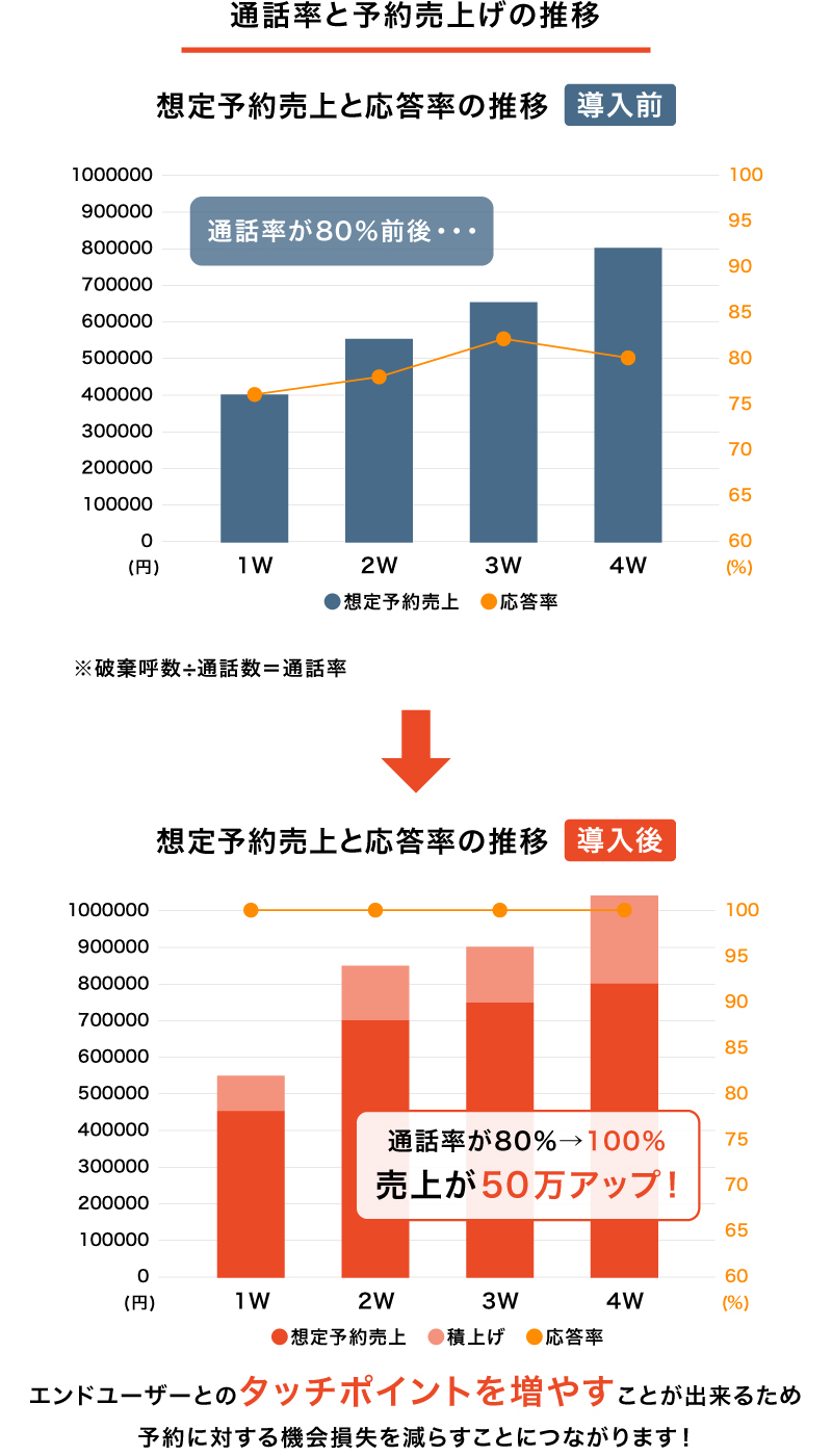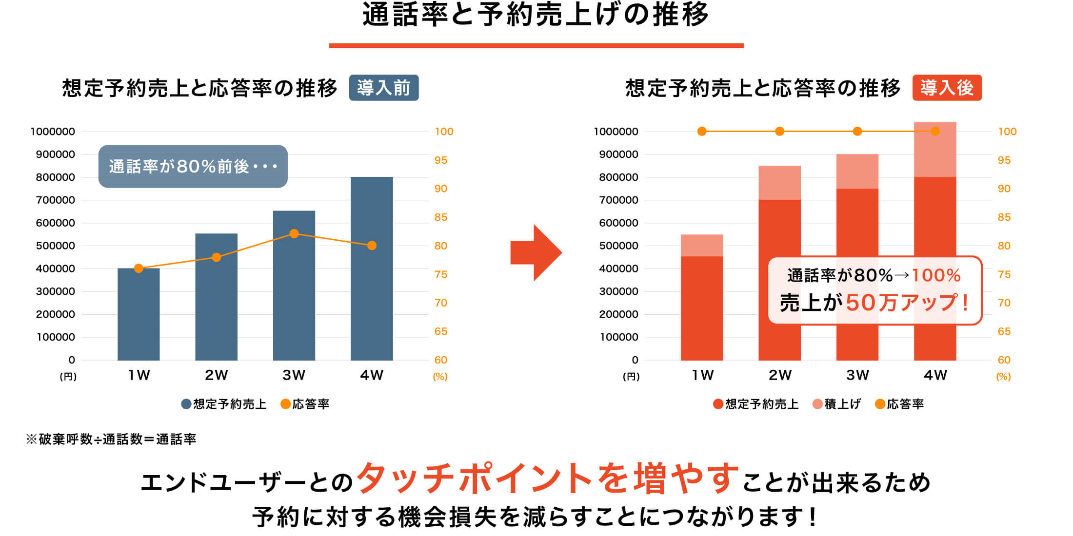 人手不足で忙しいなか、店舗運営と電話対応の両方を完璧にこなすのは簡単なことではありませんが、電話を取れないのは紛れもない「機会損失」です。よやくるーを導入することで、これまで損失していた機会をキャッチでき、通話率・成約率が向上。確実に売上へと転換できます。